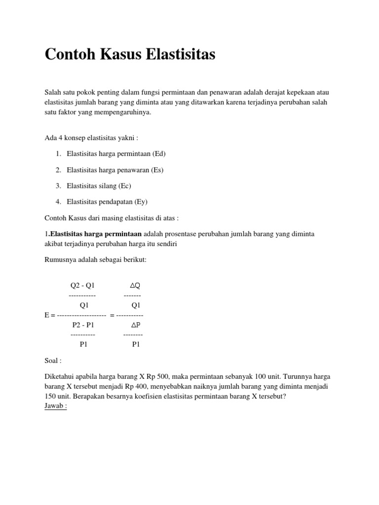 Deformasi (perubahan bentuk) pada benda padat elastis. Agar dapat menjawab soal seperti di atas, kamu harus sudah paham konsep dasar atau definisi dari elastisitas permintaan. Elastisitas permintaan dinyatakan dengan sebuah koefesien yaitu koefesien elastisitas dan dinotasikan dengan huruf e d. Pada dasarnya, elastisitas memiliki pengertian pengaruh perubahan harga terhadap jumlah barang atau jasa yang diminta atau yang ditawarkan. Contoh soal fungsi permintaan penawaran.demikianlah tadi pembahasan mengenai fungsi permintaan dan penawaran serta beberapa contoh soalnya. Contoh soal elastisitas permintaan dan penawaran nomor 2 pembahasan. Berikut ini akan ditampilkan beberapa soal uraian atau essay dan pembahasan. Hitung elastisitas titik pada harga rp 50 dan jumlah barang yang diminta 300 jika fungsi permintaannya adalah q d 400 2p. Contoh soal dan pembahasan elastisitas kelas 11. Artinya kalau hanya ditampilkan soal saja boleh jadi pemikiran hanya terkhusus pada. Permintaan atau penawaran dikatakan elastistias sempurna jika nilai e tak hingga permintaan atau penawaran dikatakan inelastis sempurna jika nilai nilai e 0 untuk lebih memperjelas pemahaman anda tentang elastisitas dibawah ini kami sajikan contoh soal dan pembahasan yang berkaitan dengan elastisitas permintan dan elstisitas penawaran. Oleh samhis setiawan diposting pada 27 juli 2021. Soal yang disajikan memiliki banyak tipe soal yang.