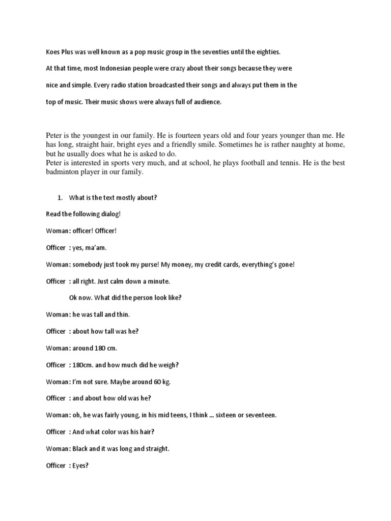Orchard is always crowded so you have to be careful in order not to get lost. Di sore yang diwarnai dengan rintikan hujan ini, saya akan memberika contoh soal descriptive text sebanyak 11 lembar. Peter is the youngest in our family. Text of contoh soal descriptive text. He has long, straight hair, bright eyes and a friendly smile.