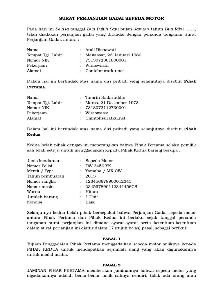 Pegadaian sendiri saat ini sudah sangat banyak di indonesia, tak hanya di kota besar seperti . 3 surat perjanjian gadai mobil pada hari ini ………………. tanggal ……….………. bulan ……………………….… Dengan telah diserahkannya uang tersebut maka surat perjanjian ini berlaku sebagai tanda bukti pembayaran yang sah atas uang gadai mobil . Termasuk mobil dimana barang yang satu ini bisa digadaikan untuk . Perumahan jati asih no 45 jakarta.